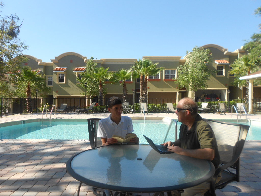 Several months ago Pastor Claudette told me her son, Adrian wanted to study the Bible with me. We studied the “In Light of The Cross” Bible study guides, and over the course of the studies, Adrian told me he wanted to be baptized. Adrian was very committed to his Bible study time. Adrian is a big basketball fan. One evening he invited me to stay and watch a basketball game after our Bible study. We had finished the lesson and the game had already begun, but Adrian still had a lot of questions, so we continued our study for quite a while before finally watching the game. The fact that Adrian was a big basketball fan, but wanted to keep talking about God and the Bible instead of just stopping the Bible study to watch the game said a lot to me about his priorities and interest in God. In the picture above, Adrian and I are studying by his pool, where one day we took advantage of the beautiful Florida weather.